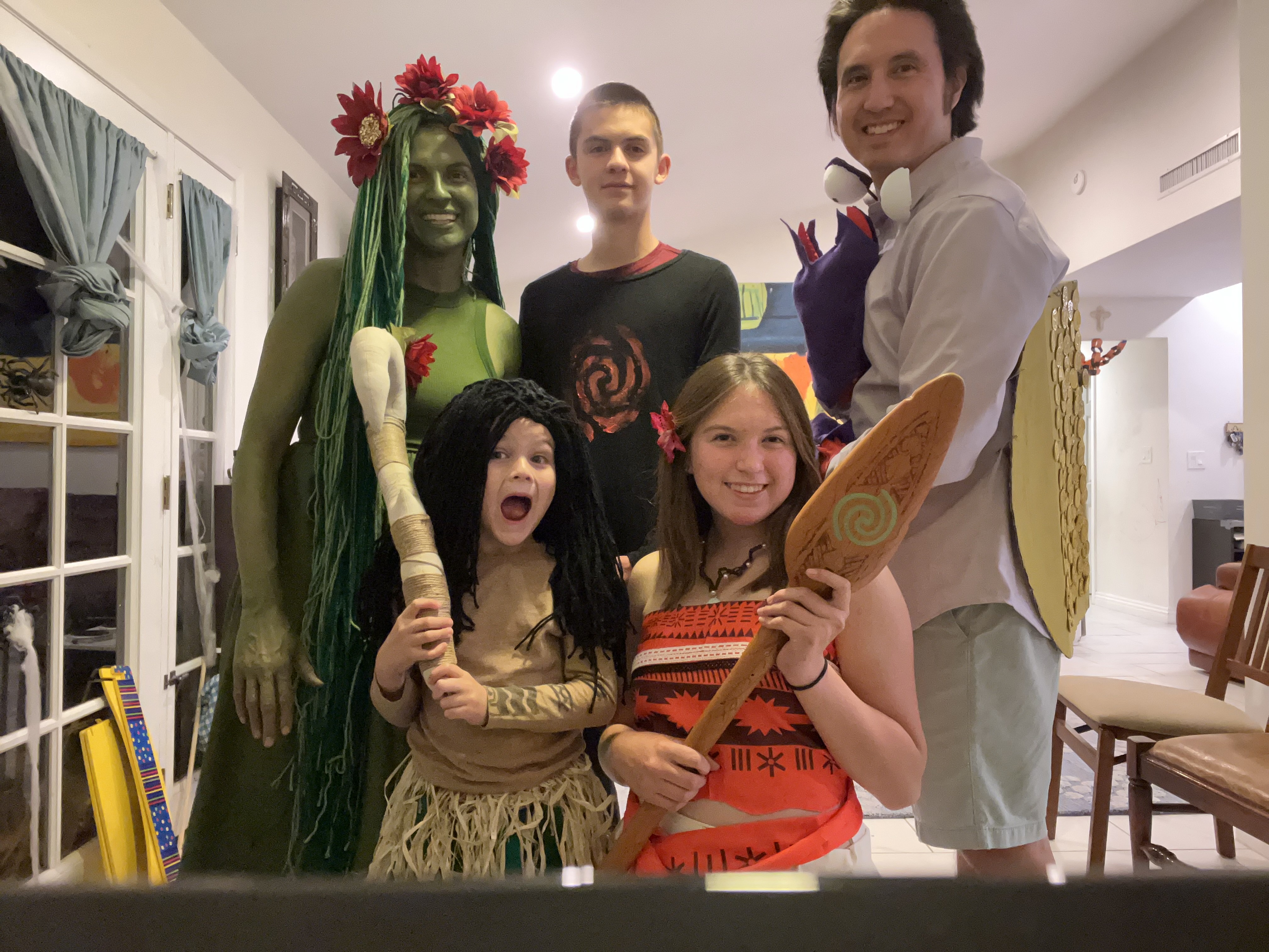 This is my favorite of all our family costumes so far. We bought the Moana costume on Amazon and made a few alterations, and were pretty much able to DIY the rest, only buying a few special pieces. My favorite was the Hey Hey costume from Primary - it was surprisingly easy for a total beginner like me to put together! I did spend some time making yarn wigs for Tefiti and Maui, but it was easy to do. We found an awesome Maui hook made out of cloth and stuffing on Etsy that my kids are still using for pretend play.