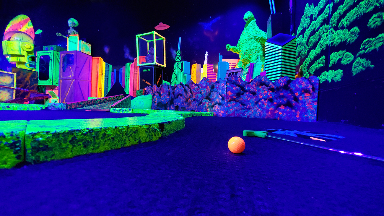 Space Golf is an entire indoor miniature golf course that is open year round and lit with ultra-violet fixtures (black lights)! Explore 18 holes of adventure mini golf featuring alien planets, giant robots and space creatures that all glow in fluorescent bursts of color. Birthday parties include both space golf time and arcade time.